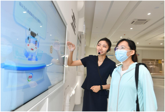 在奶粉全球智造标杆基地,工作人员向游客讲解乳制品营养知识。