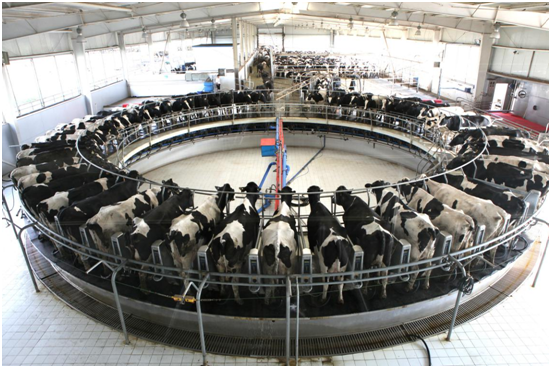 伊利敕勒川精品奶源基地内的转盘式挤奶设备