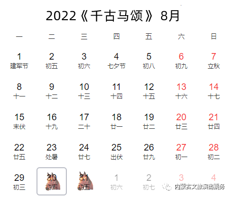 大公网内蒙古频道8月31日讯(记者 王月)大型马舞剧《千古马颂》2022年金秋演出季于8月30日拉开帷幕,演出季将持续至10月5日,期间每周五六日晚8点在敕勒川草原精彩上演,9月每周日场为惠民场,280元票档惠民价100元。整个演出季共安排20场演出。