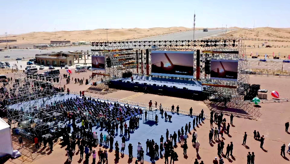 4月29日,2023全国自驾露营旅游发展大会在阿拉善梦想沙漠公园盛大开幕,八方宾朋一同观看阿拉善文旅宣传片。