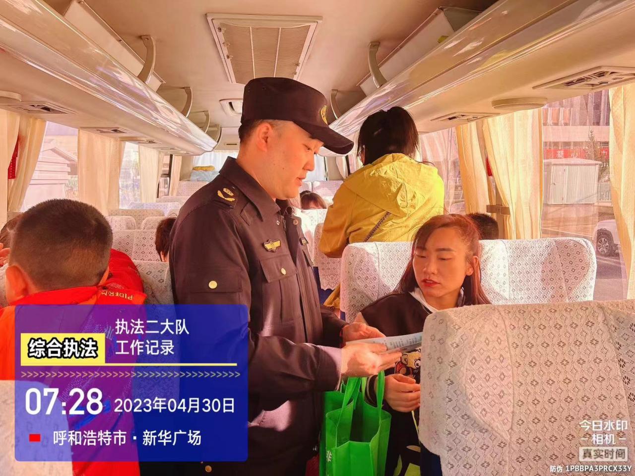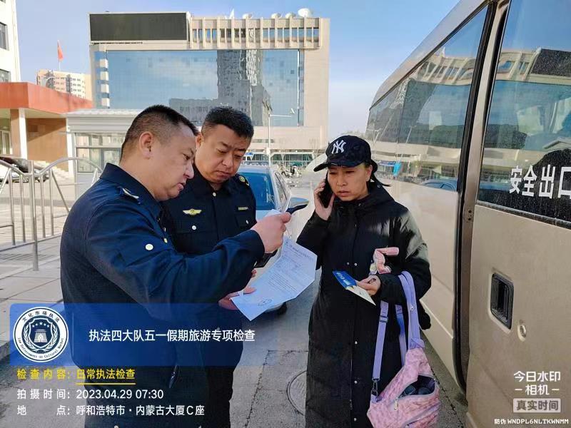 4月29日-4月30日,呼和浩特市文化市场综合行政执法局与呼和浩特市交通运输综合行政执法支队联合开展旅游市场专项整治行动。本次检查重点是严厉打击“不合理低价游”、整治“黑旅游”“黑导游”、超范围经营、旅游营运车辆非法行为。执法人员对内蒙古博物院、宝尔汗佛塔广场、新华广场、昭君博物院景区、蒙亮民族风情园、莫尼山非遗小镇等旅游集散地及景区进行执法检查。按照执法权限分别对车辆的营运手续、司机营运手续、包车牌和旅行社与旅游者签订旅游合同、导游人员是否规范执业进行检查。查处1起新华广场未开包车牌、未年审及动态不在线旅游包车。检查中,执法人员注重扩大法律宣传,执法人员在向游客了解旅游行程和体验情况,同时向游客讲解了旅游法规常识以及安全注意事项,发放“出行旅游安全提示”宣传单。