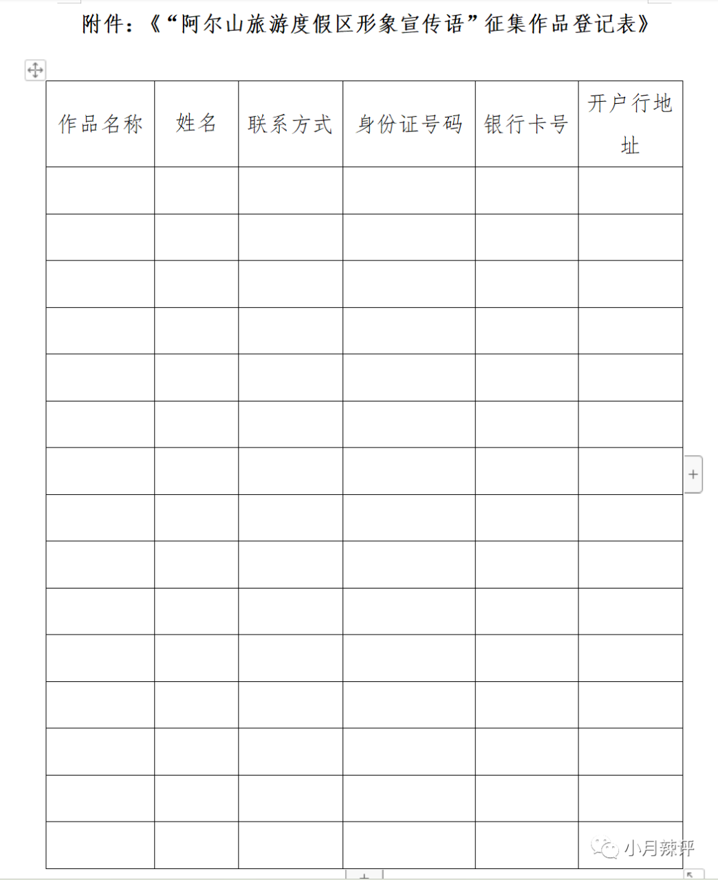 填写《“阿尔山旅游度假区形象宣传语”征集作品登记表》,采取电子稿件方式,以邮件附件形式发送。投稿邮件标题:姓名+“阿尔山旅游度假区形象宣传语”应征作品投稿邮箱:AERSHANwenlian@163.com,联系人:赵景新,咨询电话:0482-7125551( 工作日08:30-11:30,14:30-17:30拨打)