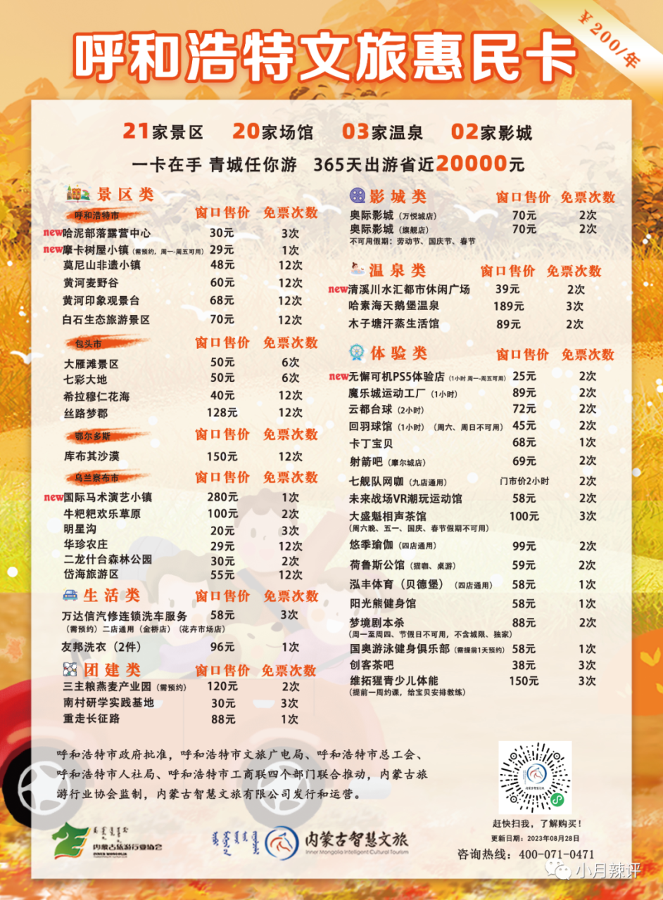 展会也汇聚了来自全国各地的广告礼品公司、礼品分销商、渠道商、大中型企事业单位采购人员等各类买家,精准对接内蒙古自治区礼品渠道。作为呼和浩特地区最受市民欢迎的文旅惠民卡在本次盛会上亮相,正值呼和浩特文旅惠民卡上线发行2周年之际,在呼和浩特市总工会、市人社局、市工商联、中国银联、新华发行集团等企事业单位以及本地文旅行业企业的大力支持下,惠民卡由刚上线的30家增加到40多家景区和场馆,其中包含21家景区、20家场馆、3家温泉、2家影城全部免票畅玩儿,真正做到了一卡在手,青城任你游,365天出游省近20000元,市民只需花200元即可享有超值权益,便捷的入园体验,实用的旅行路线、好玩的出游攻略分享、再加贴心的客户服务。