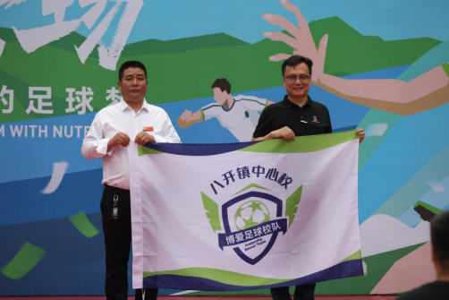 中国红十字基金会副秘书长郭阳为榕江县八开镇中心校颁发“博爱足球校队”队旗