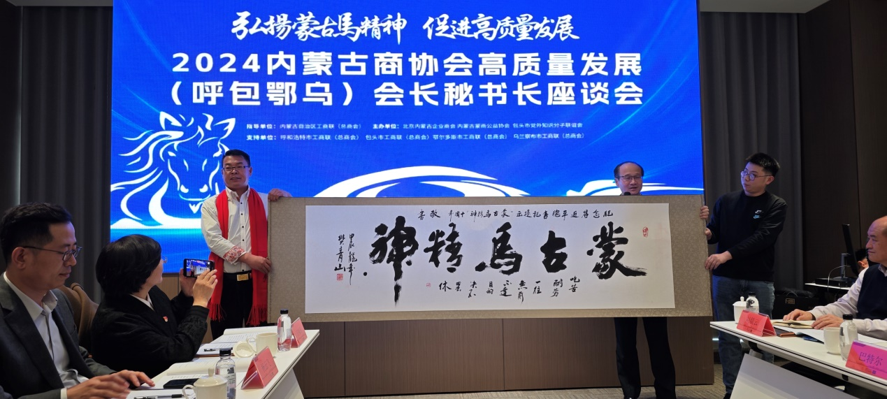 座谈会上,呼和浩特市工商联主席王慜、乌兰察布市工商联主席侯金梅,包头市工商联党组成员、副主席张文杰,鄂尔多斯市工商联二级调研员刘晨云分别从呼和浩特市、乌兰察布市、包头市、鄂尔多斯市四城的经济、能源、招商引资引才引智等优势资源进行了推介,30多位与会会长、秘书长围绕会议主题分别从各自不同角度作了交流发言。国礼艺术大师樊青山文商旅艺术书画院院长樊青山向内蒙古蒙商公益协会赠送了《弘扬蒙古马精神》主题书法作品。会上,还发出《弘扬“蒙古马精神”,协同促进民营经济高质量发展倡议书》,呼吁各商协会、企业家们要突出“联”字作用,创新发展。倡议,民营企业和商会、协会像蒙古马一样勇往直前,锚定经济建设主战场,搭建“呼包鄂乌城市群”商会协会合作大平台,促进内蒙古民营经济高质量发展。