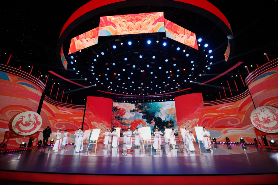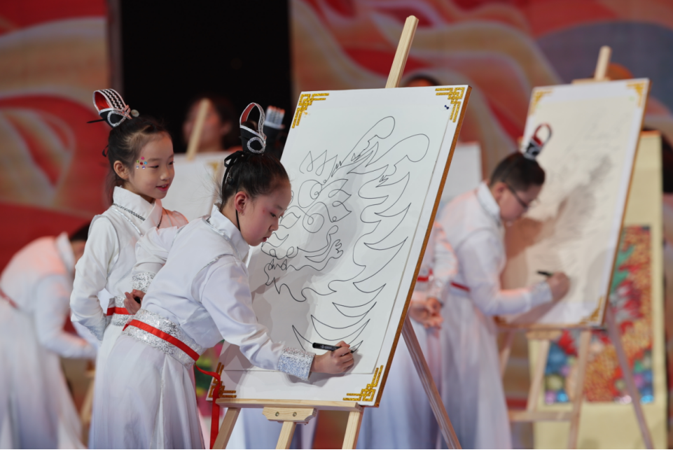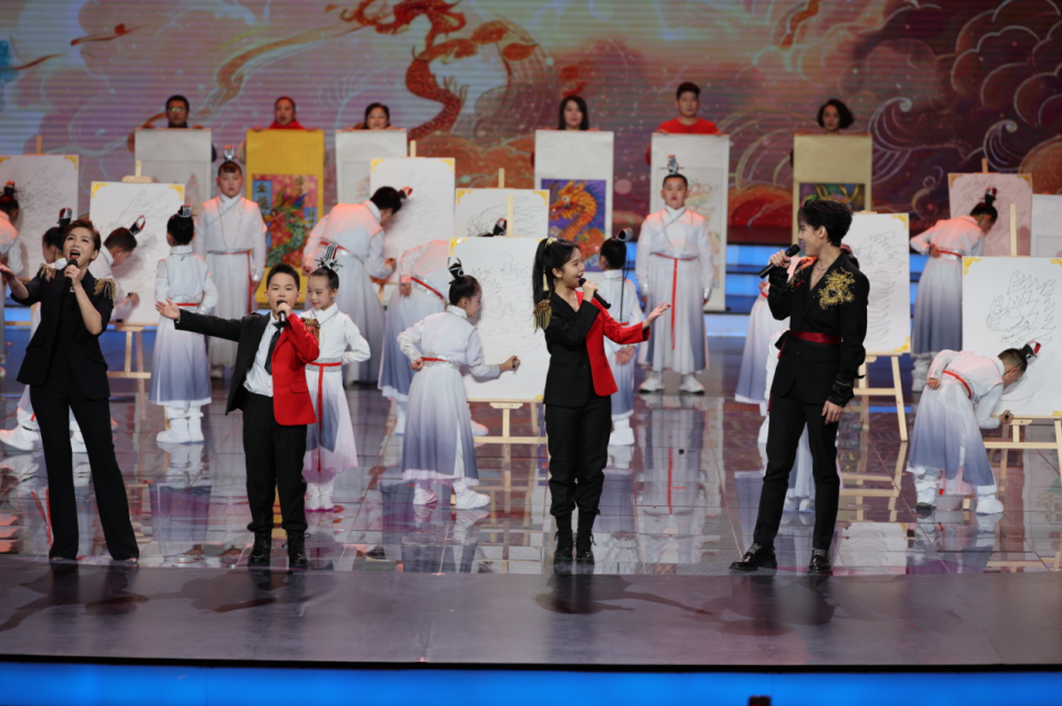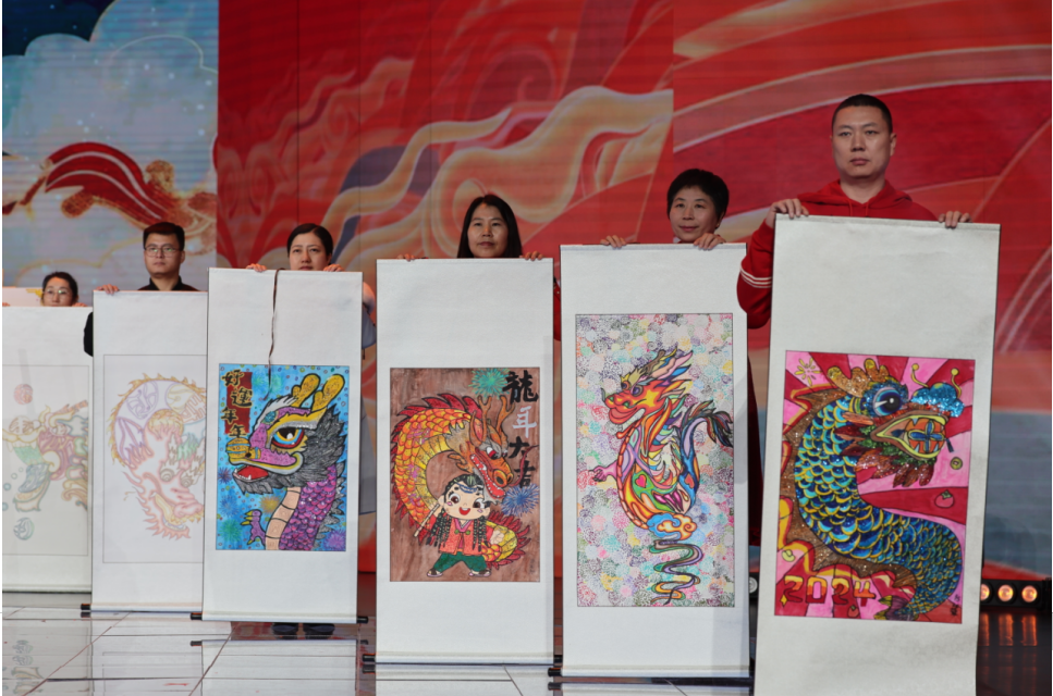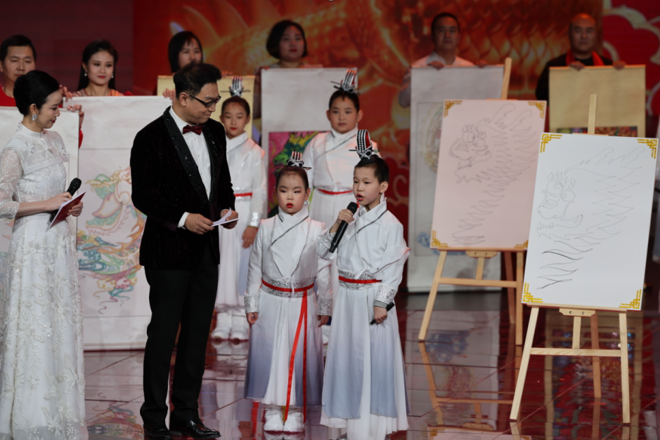 在晚会现场以歌舞画于一体的创意歌舞节目《龙颜》成为了独具特色的焦点 。晨旭艺校的孩子们以国风服装、太极元素的舞蹈和画作展示了中国的龙年精神。孩子们身着精致的国风服装,伴随着原创龙年主题歌曲《龙颜》的优美旋律翩翩起舞。他们的舞蹈中融入了极元素,展现了中华文化的独特魅力。而画作部分更是令人惊叹,11名小画家仅用1分25秒的时间,用一笔画的技法一气呵成地在画板上完成了一条栩栩如生的金龙。此外,还有16名小画家以自己的名字为创意元素,创作了彩色钢笔画和龙年主题年画作品《龙的传人》。这些画作与舞蹈和画作相得益彰,让现场的领导和嘉宾深感《龙颜》节目的独特创意的力量。