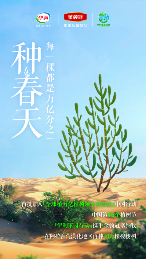 为保护生物多样性,伊利从2016年开始实施“伊利家园行动”公益项目。在“伊利家园行动”的号召下,去年3月12日,金领冠塞纳牧首次开展植树公益活动,联合中国绿化基金会在阿拉善荒漠化地区种下10万棵梭梭树。这些梭梭树成活率达84%,成年后能累积固沙84万平方米。