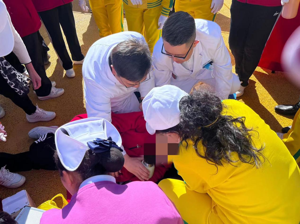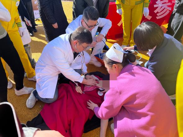 经检查发现老人虽未完全失去意识,但面色苍白,无法自主表述。刘主任便尝试跟老人同行人员进行沟通,询问其病史、测量血压血糖等情况,邵嘉乐与韩涛当即脱下自己的外套垫在老人身下使其平躺,并取来氧气袋让患者吸氧,为其测量血压等生命体征,用温柔舒缓的语气不断进行心理疏导、安慰老人。经判断,考虑患者是因体位性低血压而晕倒。在刘主任的指导下,现场工作人员及其他义诊医生将现场围观群众疏散开,与患者保持一定的距离,以便空气流通。