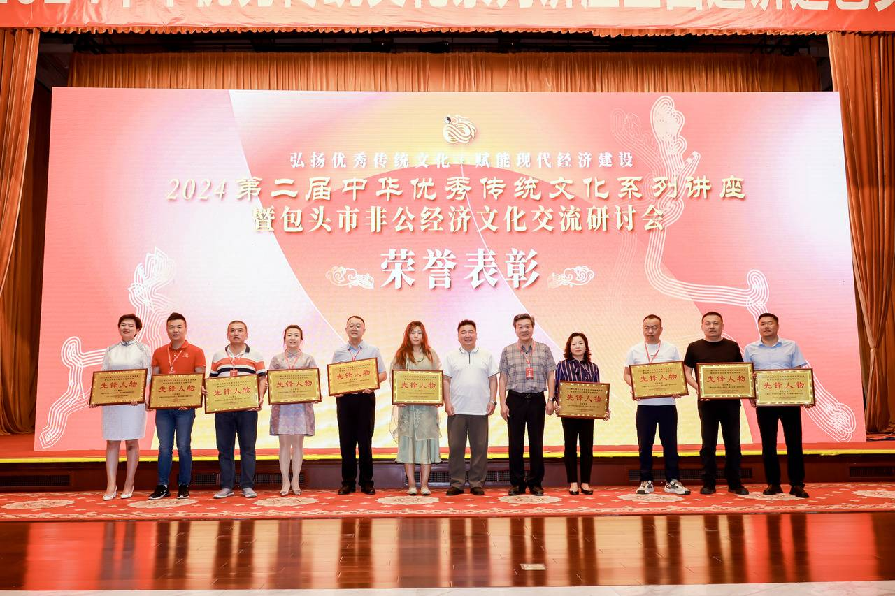 为了鼓励更多的人积极参与推动中华优秀传统文化系列讲座在全国巡讲顺利举办,会务组现场表彰了为本次会议提供赞助与持的业与个人。姜琳、赵蒙莉、王斌、王世明、吴德荣、薛华、赵国栋、姜懿晨、陆玉龙、唐雪梅、刘宏平等获得2024弘扬优秀传统文化“先锋人物”荣誉表彰。本次活动也得到了民革包头市委员会、包头市工商联,内蒙古环保科技行业协会、内蒙古城市文化产业商会、内蒙古食品商会、内蒙古名优产品促进会、包头市传统文化促进会、包头市道德志愿者协会、包头女商联合会、润疆情内蒙古公司、佘太酒业、蒙乐缘食品、华洋生态园、译泰建设、蒙糯糯食品等单位的大力支持。