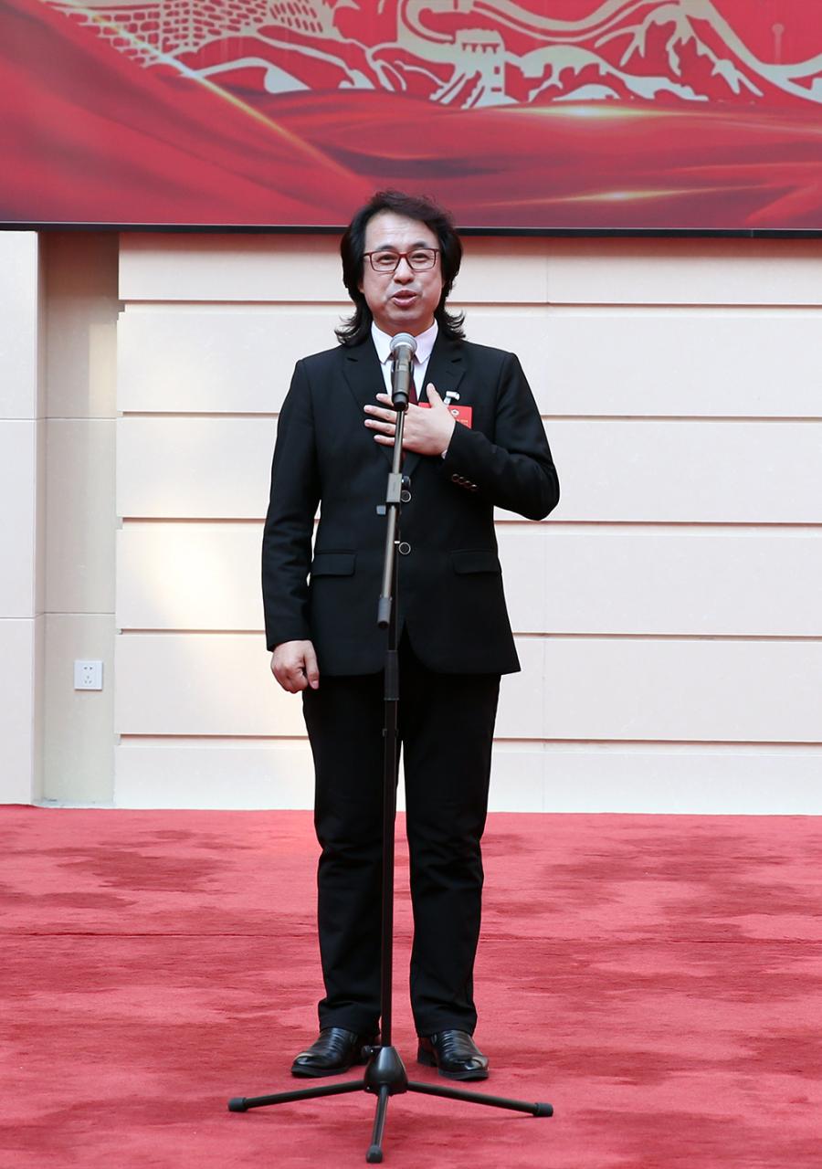 自治区政协常委,青年歌唱家、文化学者张永强在内蒙古自治区两会第二场“委员通道”现场。新华网 杨腾格尔 摄