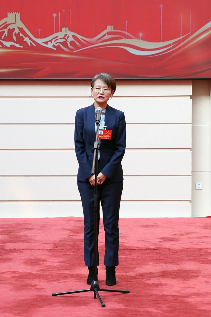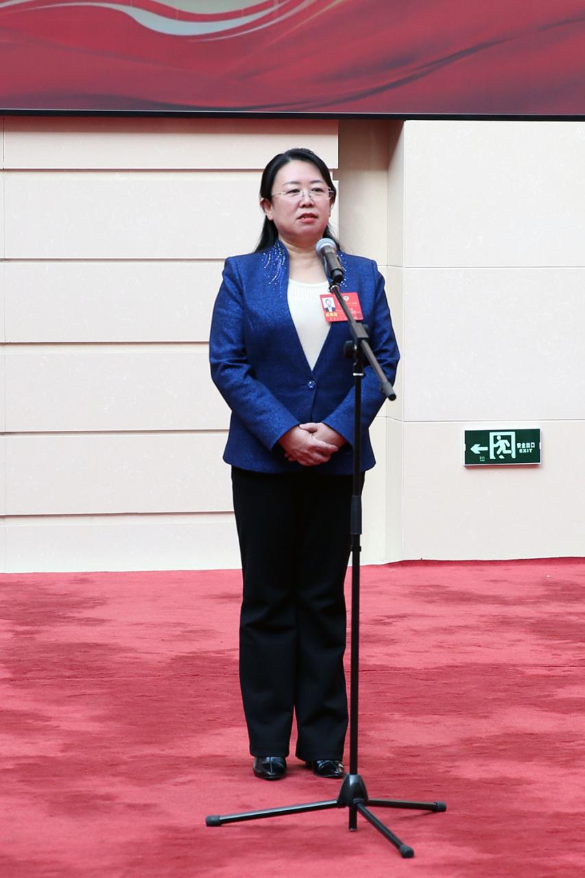 自治区政协委员、通辽市科尔沁区副区长杨秀媛在内蒙古自治区两会第二场“委员通道”现场。新华网 杨腾格尔 摄