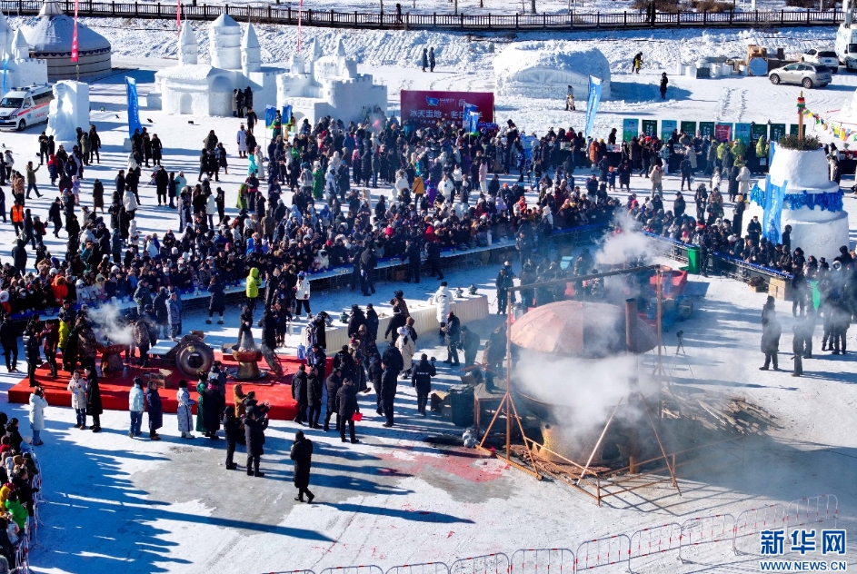 1月19日,市民和游客在内蒙古首届草原涮肉节品尝涮肉(无人机照片)。