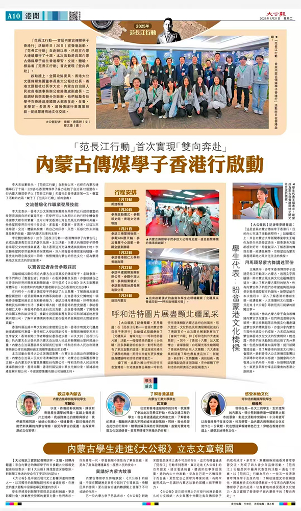 (大公文匯網記者 喬輝、王月)1月20日,「范長江行動–首屆內蒙古傳媒學子香港行」活動在香港正式啟動。來自內蒙古9所大學的12位學子首站走進香港大公文匯傳媒集團旗下《大公報》、《文匯報》的報史館及全媒體新聞中心,了解兩報及新媒體發展歷程及新趨勢,感受新聞事業的傳承與創新。