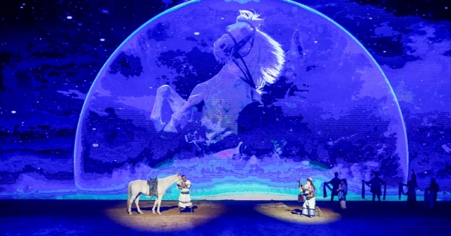 《千古马颂》是 2014 年内蒙古艺术剧院贯彻落实习近平总书记考察内蒙古时重要讲话精神,倾力打造的一部文化和旅游深度融合的全景式大型马舞剧。该剧通过讲述一位牧人之子的成长故事,生动演绎人与马相遇、相知、 相伴、不离不弃、生死与共的情感历程,用人与马、人与自然和谐共处、诗意栖息的大美境界,折射出守望相助、 团结奋进、坚韧不拔、开放包容的人文精神。全剧以马表演为主,综合运用歌、舞、乐、杂技等艺术元素,融合高 清投影、全景LED 等现代舞美技术。蒙古马、汗血宝马、卢西塔诺、弗里斯兰、安达卢西亚、德保矮马、阿拉伯马 等百余匹名马、百名骑手组成庞大阵容的表演,使整场演出恢弘震撼,充满视觉冲击力。