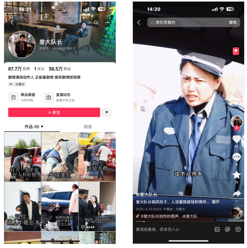 “来往走开,这儿不让停车……”近日,抖音账号“曾大队长”凭借一段魔性音乐与生动演绎,将一位市侩的“女保安”形象刻画得入木三分,迅速在短视频平台掀起热潮。短短一个月,该账号粉丝量飙升至38.5万+,其饰演者曾海荣也借此成功“出圈”。然而,曾海荣的走红绝非偶然。