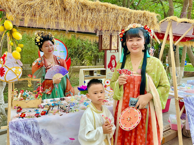 作为活动人气焦点之一,“鹊梦星河·国风雅集”国风集市以“爱情时光轴”为核心,打造六大主题体验区,涵盖趣味打卡、非遗展示、文创售卖等项目,现场人头攒动、热闹非凡。集市上每个摊位前都排起长队,市民体验剪纸、书法、七巧板等项目,换上汉服穿梭于集市中,仿佛“穿越”回古代。除此之外,市民参与打卡互动游戏集齐贴纸,还可以兑换爱心发夹、四合木河灯等纪念品,此环节更让集市充满互动乐趣,充分体现高参与度。