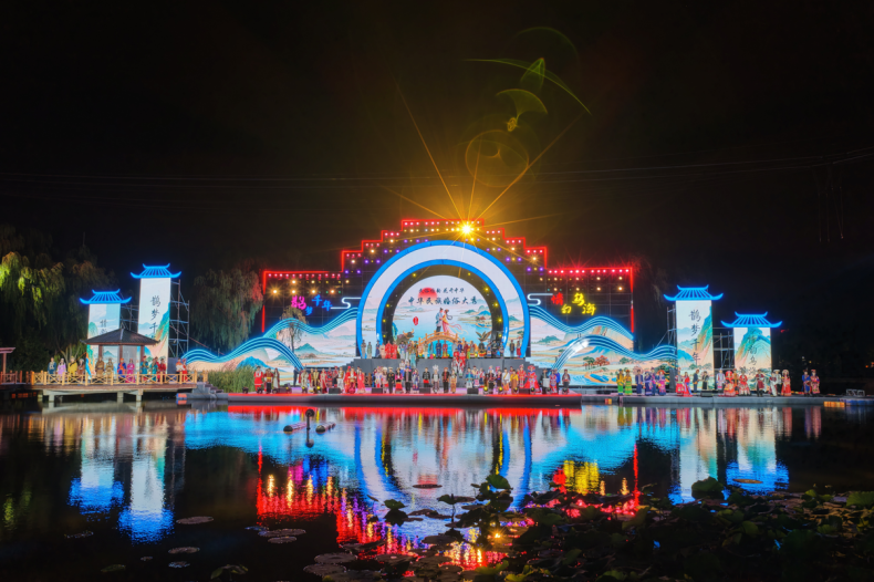 最后登场的是《民俗雅韵 花开中华》中华民族婚俗文化大秀,展现中华56个民族的婚俗特色,绚丽的服饰与独特的仪式感,让市民直观感受“民族团结一家亲”的和谐氛围,不少人拿出手机记录这一精彩瞬间。据活动项目负责人闫磊介绍,本次演出精心打造特色水上舞台,采用视觉微粒子动态视频效果,结合高空威亚,实现了美轮美奂的星空穿越鹊桥相会画面。