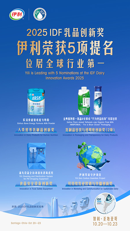 近年来,伊利在“IDF乳品创新奖”评选中屡获殊荣,共斩获6项大奖、11项提名,成果涵盖产品创新、可持续包装、食品安全与质量管理、消费者营养、女性赋能、可持续农业与气候行动、市场营销与传播等多个领域。不仅彰显了伊利全产业链的创新实力,也展现出中国乳业高质量发展的强劲动力与全球影响力。