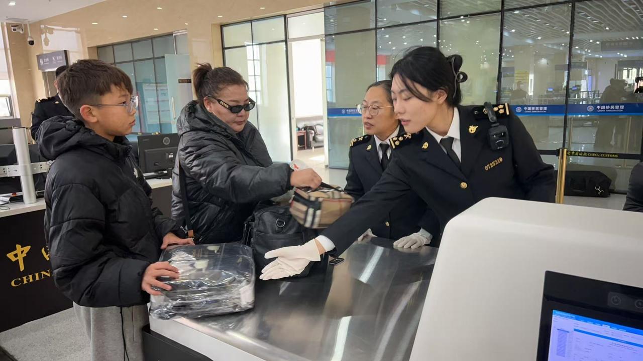 在二连浩特公路口岸出境大厅,记者看到提着大包、小包、的来自蒙古国的巴雅尔,她在中国采购了大量中国制造物品,还买了自己心仪的衣服。