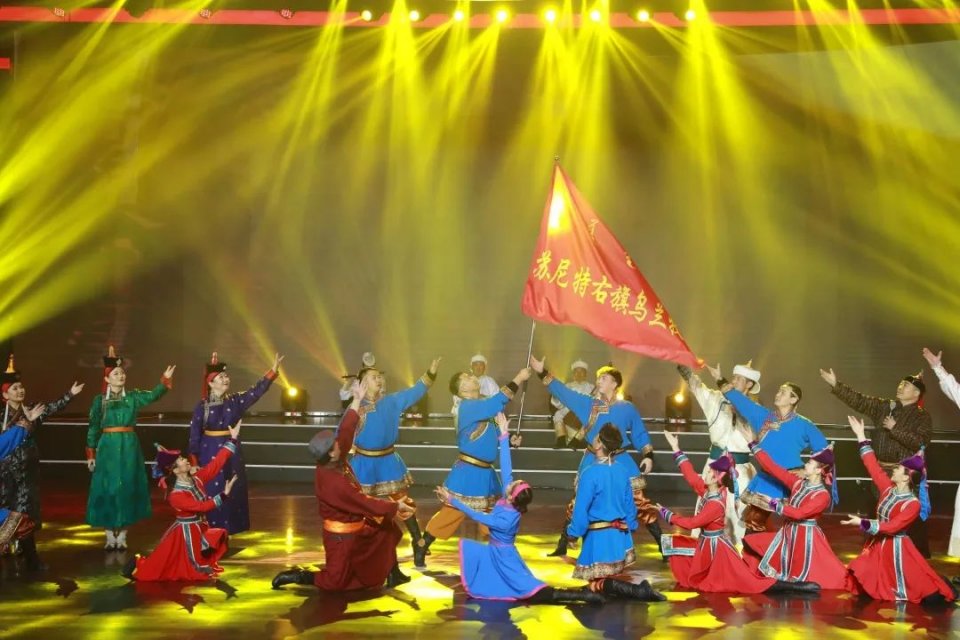 一场独具浓郁民族特色的精彩演出在开场情景歌舞《最美奋斗者》中拉开帷幕,演员们带来了歌曲《胡杨》、《那一年》、《共筑中国梦》、群舞《驼乡情》等形式多样、内容非富的蒙古族传统文艺节目。蒙古剧《朱日和情》更是把观众的思绪带到了辽阔的大草原,这部由苏尼特右旗乌兰牧骑历时3个月编排而成的现实题材的民族舞台剧,编创团队用蒙古族民族歌曲、舞蹈、曲艺为体裁,呈现出几十年前真实发生在朱日和草原上的军民故事,是一部接地气又有创新的民族舞台剧。演员们个个精神饱满,曼妙的舞姿、整齐划一的舞蹈动作、专注的表演、感人至深的情感流露,再现了各族人民建设边疆、繁荣发展、亲如一家的生动故事,博得了现场观众的阵阵掌声和喝彩。