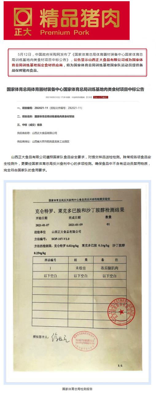 正大集团山西正大食品有限公司成为国家体育总局训练基地指定肉类供应商