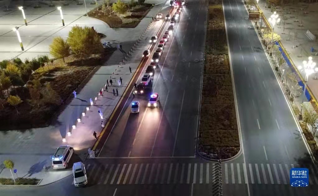 10月28日晚,即将离开额济纳旗的滞留自驾游客车队(无人机照片)。新华社记者王雪冰 摄