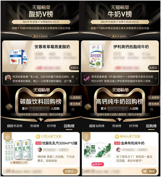 天猫平台,伊利实现品类渗透率的稳步提升,取得天猫乳饮行业品牌榜TOP1。其中,利用天猫新品创新中心(TMIC)实现消费者共创,安慕希国潮IP定制装上市即售罄;通过天猫超市全域增长引擎(UGE)样板打造,高效沉淀品牌会员,获得品牌馆会员数TOP1的佳绩,成为天猫超市品牌消费金唯一引导成交破千万品牌。