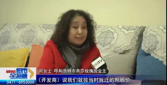 刘女士 呼和浩特市燕莎玫瑰园小区业主:我这个回迁房的时候是85平米,国家不是照顾了50平米(的价钱),50平米以外的35平米是按3850元给我置换的,它上面给我写的是(15万多元),(开发商)现在拿照顾价给我赔偿,赔我这9平米的钱,我不接受,我觉得这个不合理。