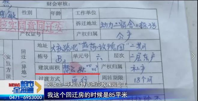 刘女士 呼和浩特市燕莎玫瑰园小区业主:当时是2006年开始拆迁的,2011年回迁的这个房子,拆迁协议的要求就是我们置换85平米的房子,2022年1月4号,通知我办房产证,上面写的就跟我的合同不一样,他那个是75.59平米,相差了9平米,不到10平米的平米差。